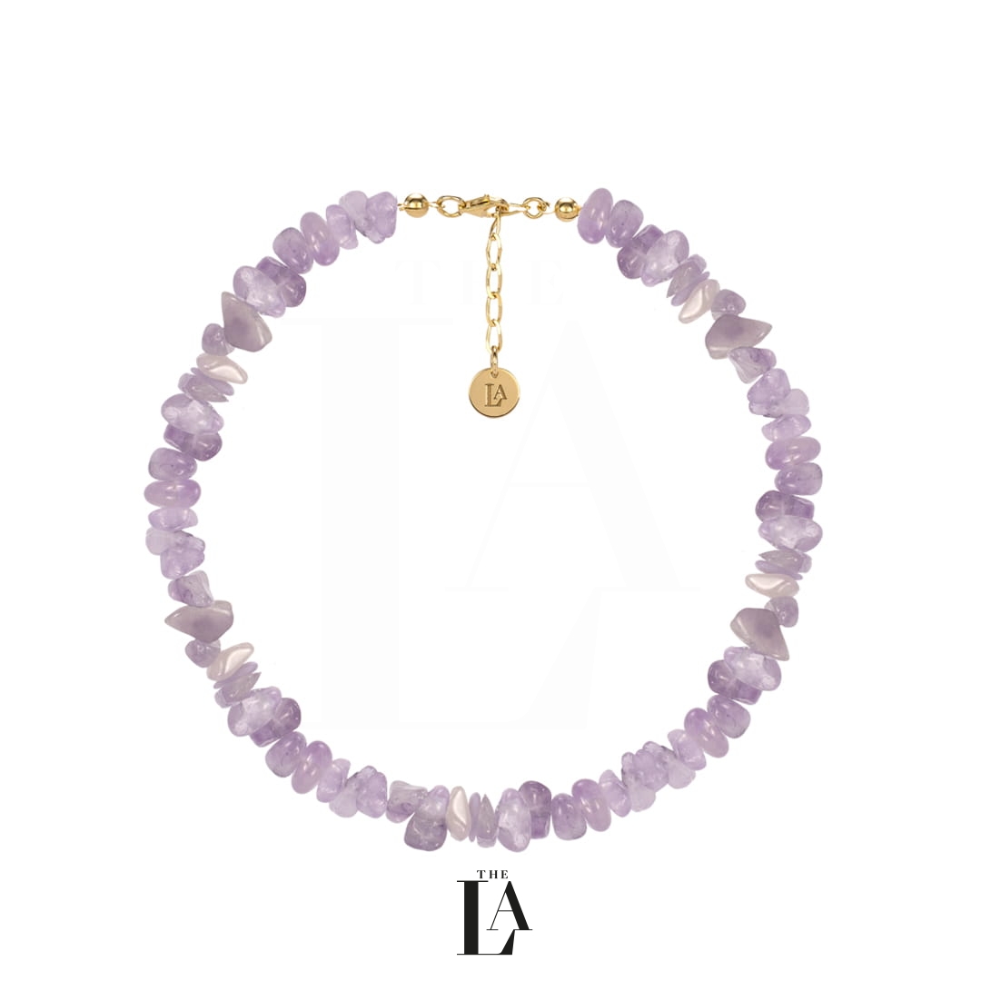 Ten wyjątkowy choker został wykonany RĘCZNIE z nieregularnego AMETYSTU oraz ze srebra 925 bez niklu pokrytego dwiema warstwami złota. Nasza biżuteria wyróżnia się delikatną złotą barwą, dzięki czemu idealnie pasuje do produktów wykonanych ze złota prób 585 oraz 333.