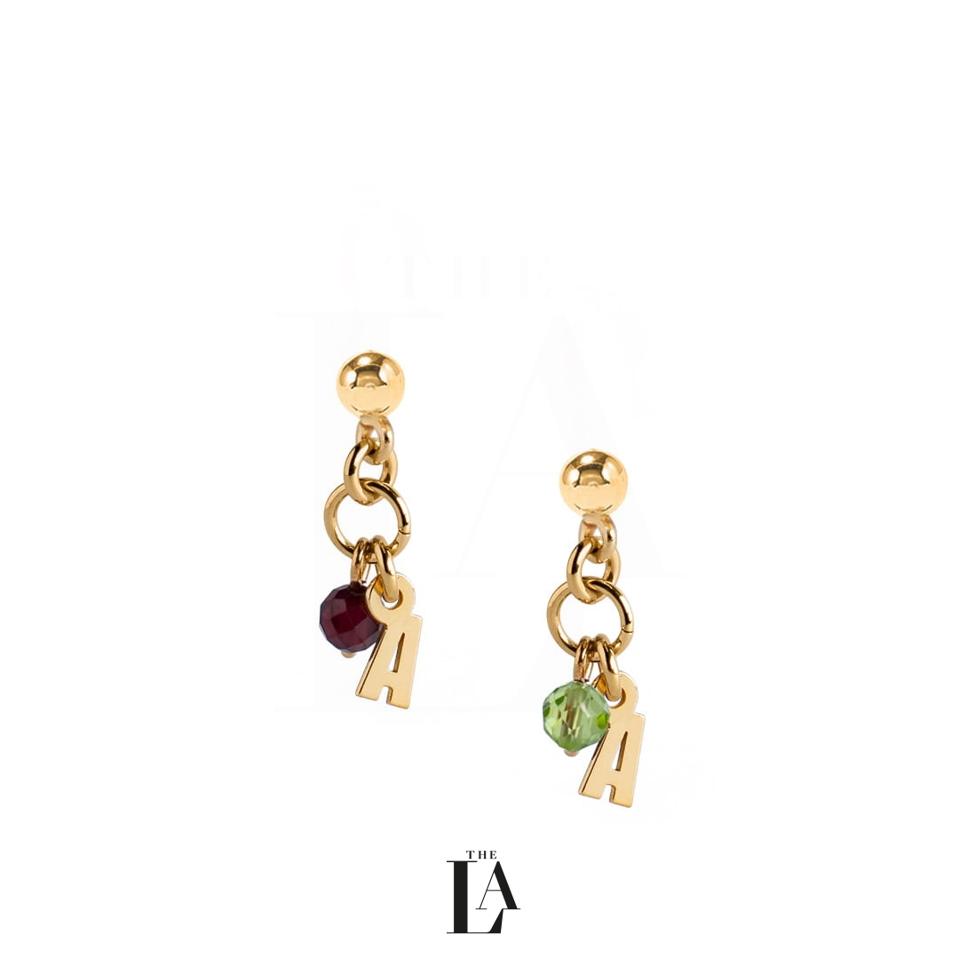 Złote Kolczyki Literki Kamień Urodzeniowy THE MOM
